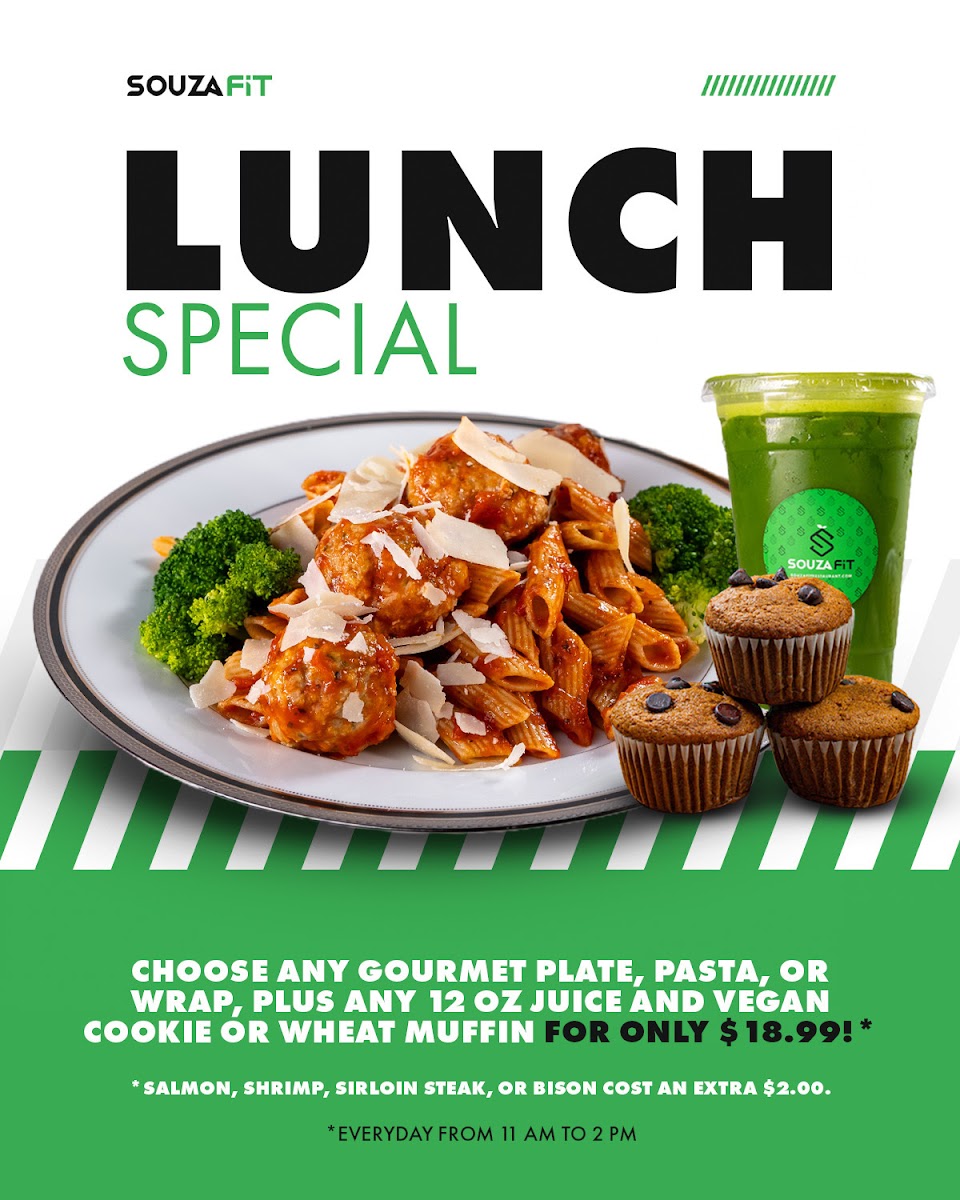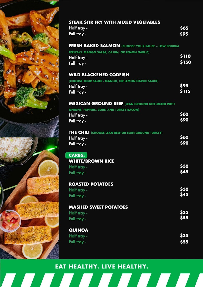 Choice of grilled chicken, shrimp or steak, mixed greens black beans, white rice, tomato, avocado, pepper jack cheese, and chipotle spread. Cal - 634G Carbs - 50G Fat - 21G Protein - 66G
