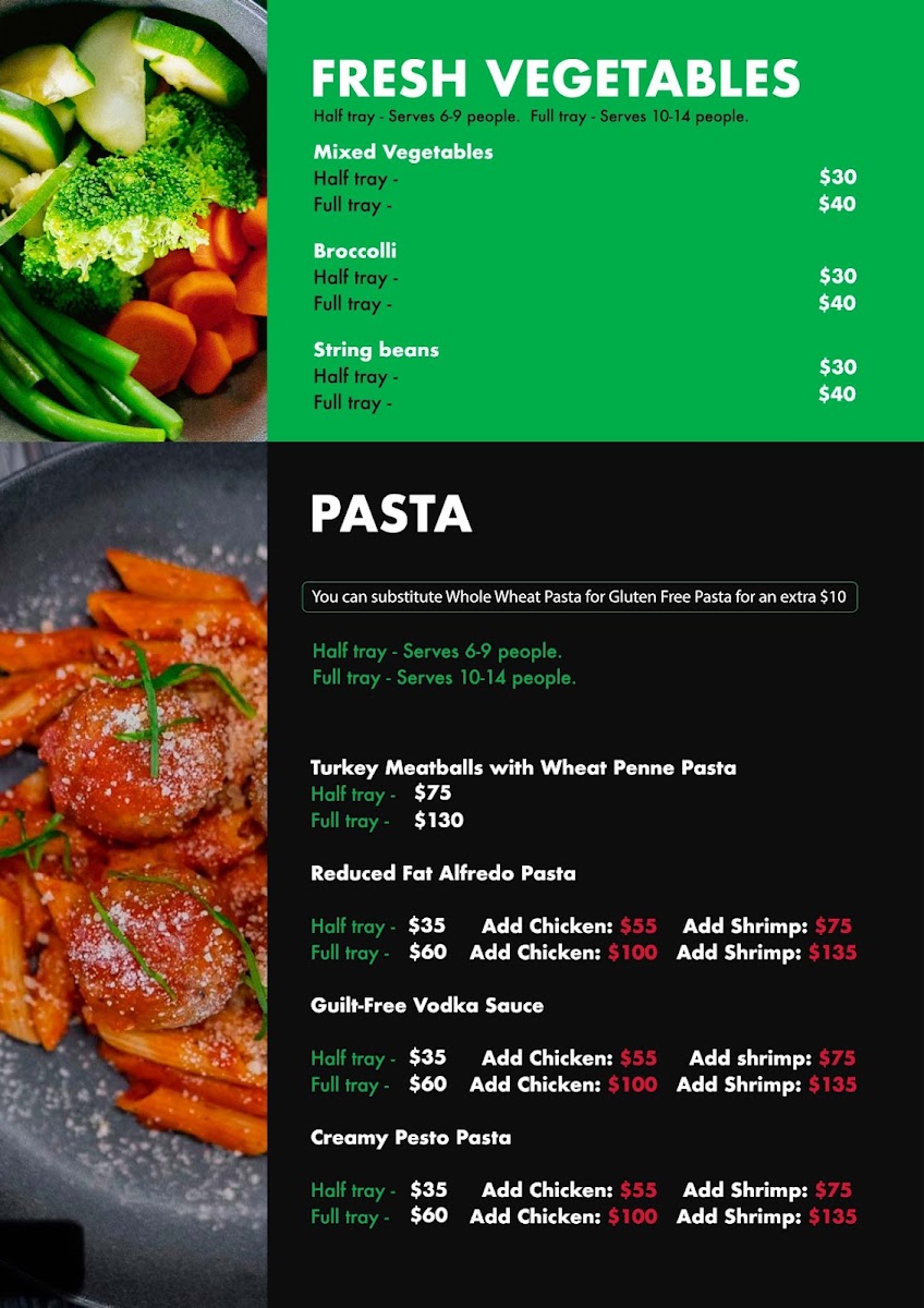 Organic spinach, grape tomatoes, and our delicious homemade creamy pesto sauce. Cal - 672G Carbs - 62G Fat - 37G Protein - 28G