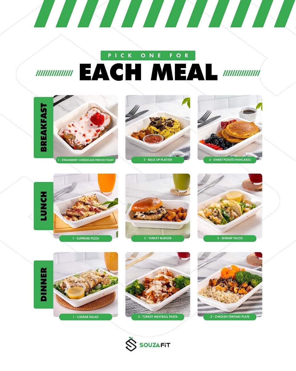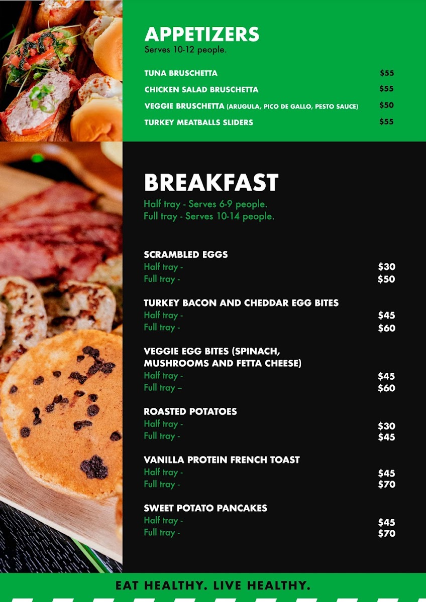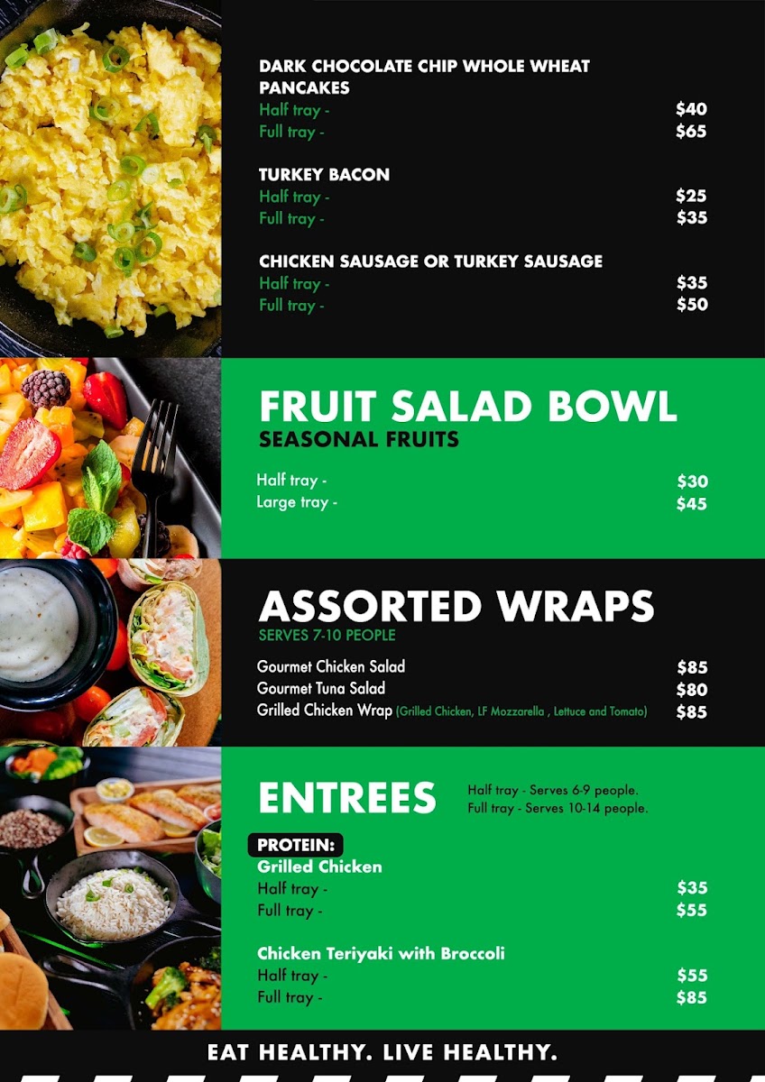 Choice of turkey bacon or turkey sausage with scrambled eggs and low-fat cheddar cheese. Cal – 338G Carbs - 4G Fat - 22G Protein - 31G